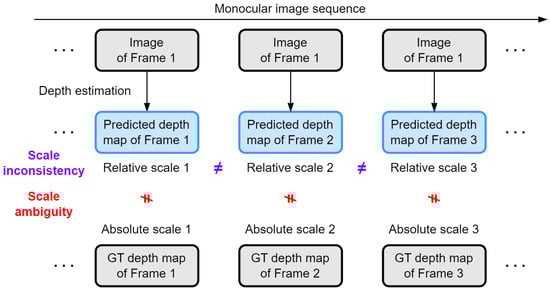 It should be emphasized that for this principle to work, the relative depth maps corresponding to the two images must be at the same scale, i.e., they are scale consistent. Fortunately, Bian et al. [,] present a scale-consistent MDE architecture by introducing a geometric consistency constraint between consecutive frames. The corresponding consistency loss is designed to minimize the geometric distance between predicted depths over the entire image sequence. The network can output depth maps with a globally consistent scale in autonomous driving scenes. Although the problem of scale ambiguity is still open, this work has laid a solid foundation for its solution.