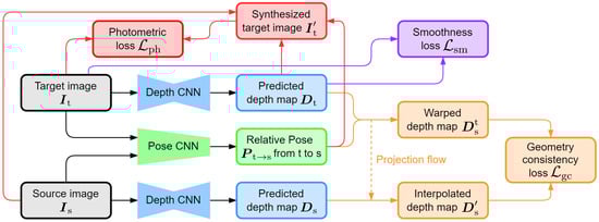 We use the network architecture proposed by [,] for scale-consistent relative depth estimation. Given two consecutive images in the training sequence, the target image and the source image , the goal in this subsection is to train a depth estimation network (depth CNN) to predict a dense relative depth map corresponding to . The depth CNN uses an encoder-decoder structure with skip connections []. And ResNet-50 [] is used as the encoder, whose weights are pre-trained on ImageNet []. The loss function for network training consists of three terms: photometric loss, smoothness loss and geometry consistency loss. The network architecture and the calculation flow of loss terms are illustrated in Figure 4.