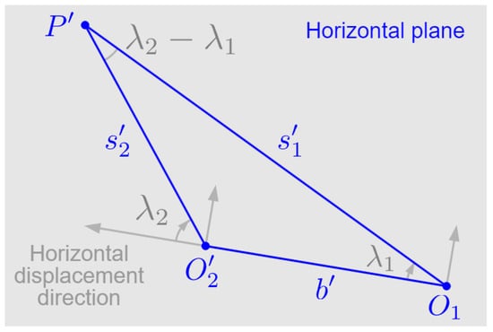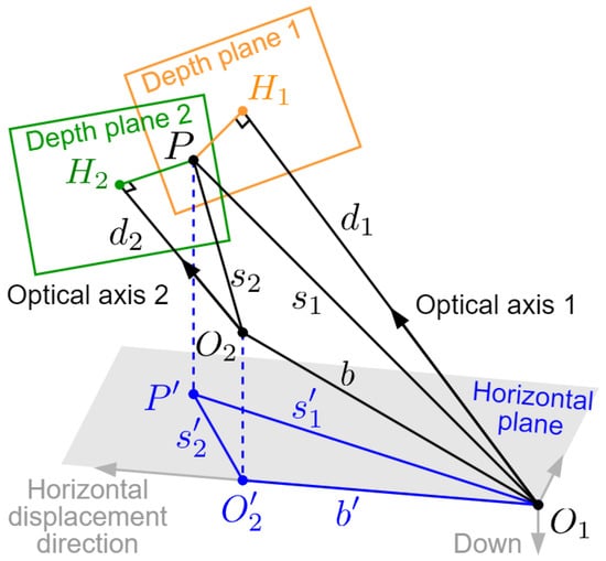 We perform the above operations and calculations for both two frames. And the last step is carried out in the horizontal plane, as shown in Figure 8. With the information of two horizontal projections of perspective depth, i.e., and , the horizontal baseline length can be calculated according to the cosine law in .