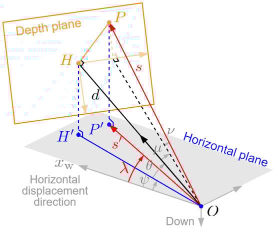 According to the camera imaging principle, the sight angles of point P is the same as those of its projection p on the image, i.e., the angles . According to trigonometry in Figure 6, the perspective depth can be calculated by