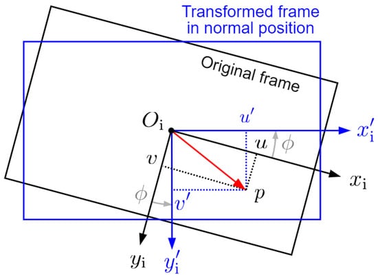 For each frame, we calculate the horizontal projection of perspective depth, including its length and direction angle , as shown in Figure 6 (omitting the subscripts 1 and 2 for a while). First, we compensate for the influence of the UAV’s roll angle. Since CNN predictions are planar depths, rolling does not affect depth values, but only changes the pixel position of projected point p in the image, and consequently, its sight angles. As shown in Figure 7, we rotate the image plane by about the z-axis (perpendicular to the paper pointing inwards) of image coordinate system, and the frame is returned to its normal position in the image plane. This is equivalent to rotating the vector by degrees about the z-axis, which can be expressed by (with the third dimension omitted)