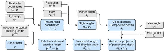 Calculation flow of relative horizontal baseline length. Gray text boxes indicate input data, and for reference and current frames.