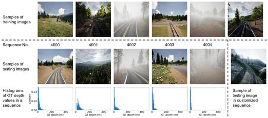 In this paper, we choose the 24 trajectories in the “PLE” environment of Mid-Air dataset [] to train the relative depth estimation network. And we choose 5 trajectories in the same environment from its official benchmark to test and evaluate our absolute depth estimation method. For simplicity, we only use the sequences synthesized in the spring season condition for training and testing, but they include four weather conditions of sunny, sunset, foggy and cloudy. Some samples of training and testing images are shown in Figure 10. Below the image samples of each testing sequence, a frequency distribution histogram of the GT depth values belonging to the ground area in the sequence is provided, representing the depth variation of the scene. The values in the GT depth maps have a long-tailed distribution. The more concentrated the data in the histogram is near the vertical axis, the flatter the depth variation in the scene.