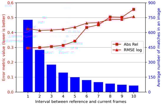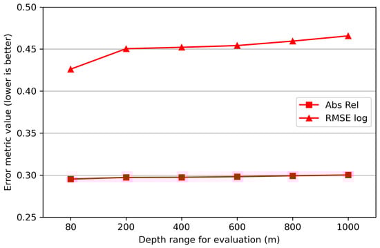 The training method of pre-training on large-scale datasets and then fine-tuning with the required scene data has been proven to be able to improve the performance of depth estimation models [,,]. Therefore, we take the depth estimation model provided by SC-Depth [] (the ResNet-50 version) as the pre-trained model, which is trained on the large-scale road driving image dataset KITTI []. We then perform fine-tuning on the Mid-Air dataset. When preparing the data, we sample the Mid-Air image sequence every 2 frames, in order to match the displacement between adjacent frames with KITTI, so that the disparity between frames is also at the same level for these two datasets, which can be beneficial for transfer learning. After sampling, there are a total of 26,466 training images and 815 testing images, with an average frame displacement of 0.9 m.