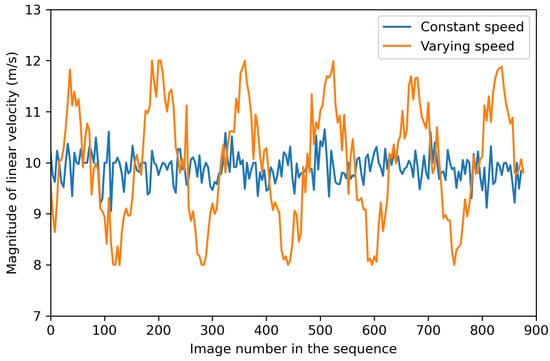 To evaluate our method under varying speeds, we collect two image sequences at constant and varying speeds respectively under the same customized flight trajectory described in Section 4.1, with the same sampling frequency and image properties. The first sequence maintains a speed of 10 m/s, while the second varies between 8 and 12 m/s, as shown in Figure 13. Table 6 shows the absolute depth estimation metrics of these two sequences. It can be seen that the accuracy of absolute depth estimation decreases slightly by about 0.4% in Abs Rel as the speed varies.