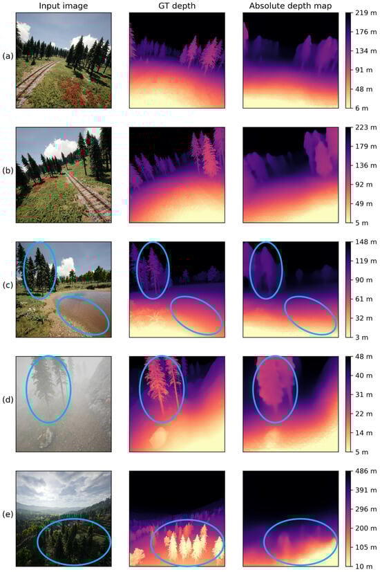 Qualitative results of our absolute depth estimation method on our flight image dataset. The areas of concern are circled in blue.