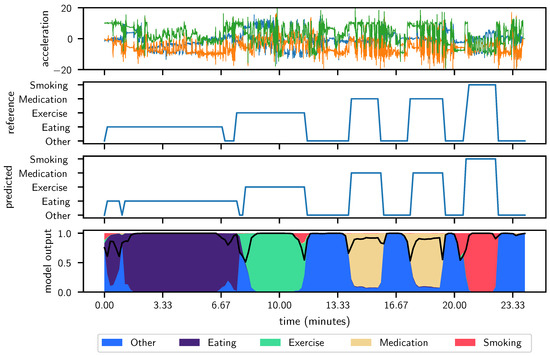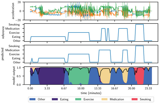 F1 score of approximately 0.85. The top panel displays the raw 100 Hz acceleration signal, which serves as the sole input for the neural network, highlighting the raw data’s complexity. The second-from-top panel shows the reference label signal defined by experts, with labels corresponding to activities such as resting, eating, exercising, taking medication, and smoking. The third-from-top presents the predicted labels from the neural network, where notable deviations from the reference signal indicate areas where the model’s performance could be improved.