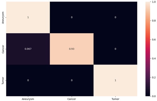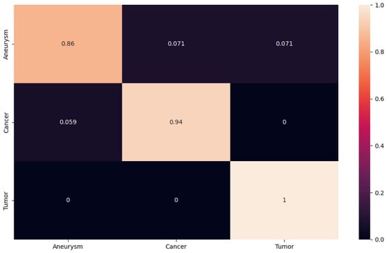 In another case, we can follow the confusion matrix on ResNet152, which achieved approximately the same results as the network suggested to us (see Figure 11). In this case, however, we observe that ResNet152 had no problem with tumor and cancer classification. The network encountered an aneurysm class error rate. In our case, the aneurysm class is the most important, as our goal is to design a NN that will classify and detect aneurysms from different modalities as accurately as possible. In this case, the network misclassified with an accuracy of 0.062 images from the aneurysm class to the tumor class.