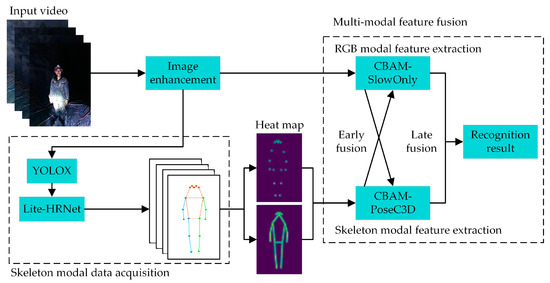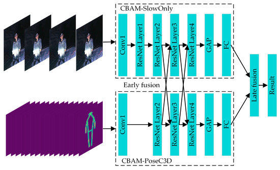 Considering the characteristics of different feature-fusion methods and the practical requirements of identifying the UAUMs, the combination of early and late fusion is used to carry out the feature fusion from the RGB and skeleton modalities to form the CBAM-MFFAR model. The architecture of the CBAM-MFFAR model is shown in Figure 10.