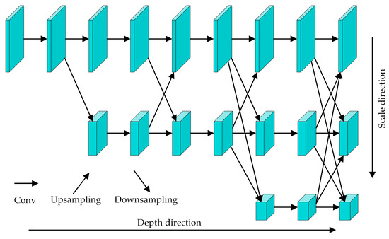 High-Resolution Network (HRNet) [27] can retain the spatial information in the image better and is suitable for detecting the spatial position information, e.g., human key points. Its basic architecture is illustrated in Figure 3. HRNet maintains a high-resolution feature map branch throughout the process, including the spatial information in the original image, and obtains the other two branches of the feature maps with lower resolution by multiple downsampling. The branches of low-resolution feature maps contain more substantial semantic information via continuous convolution, and the feature fusion between different scales is carried out by upsampling. So, the deep-level semantic information of the network is transmitted to high-resolution feature maps, which contain more substantial spatial position information. The Lite-HRNet, combined Shuffle Block in the lightweight network Shufflenet [28] with the original HRNet, is a lightweight model of the HRNet and is the top-down type of pose estimation algorithm. It replaces the 1 × 1 convolution operation in the Shuffle Block with the conditional channel weighting operation. These modifications significantly reduce the computational load of Lite-HRNet, speeding up network detection. By retaining the high-resolution feature layers of HRNet, strong semantic and spatial information can be obtained, and the precision of human skeleton key-point detection can be enhanced.