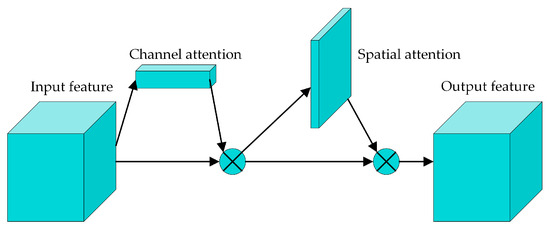 In the feature-extraction process, the attention mechanism can focus on helpful information to enhance the feature-extraction ability. The attention mechanism can be divided into channel attention, spatial attention, temporal attention, branch attention, and so on. The convolutional block attention module (CBAM) [29] is a kind of hybrid attention mechanism that combines the channel attention module (CAM) and spatial attention module (SAM), and its structure is shown in Figure 4.