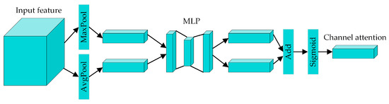 The architecture of the CAM is shown in Figure 5. Initially, the spatial dimensions of the input features are compressed by global max pooling and average pooling, aggregating the spatial information into two different feature maps: the input into the multilayer perceptron (MLP). These two feature maps are then summed together. Finally, the output channel attention feature map can be obtained through a Sigmoid function. The corresponding formula for the CAM is
