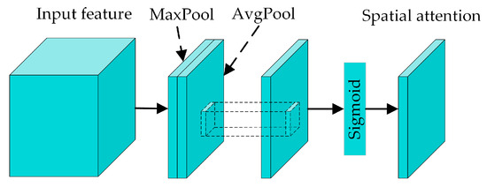 The architecture of the SAM is shown in Figure 6. Initially, the channel dimensions of the input features are compressed into two single-channel feature maps by max and average pooling operations. These two feature maps are then concatenated, followed by a convolution operation to reduce the dimensionality, aggregating the channel information to a single-channel feature map. Finally, the output spatial attention feature map can be obtained via a Sigmoid function. The corresponding formula for the SAM is
