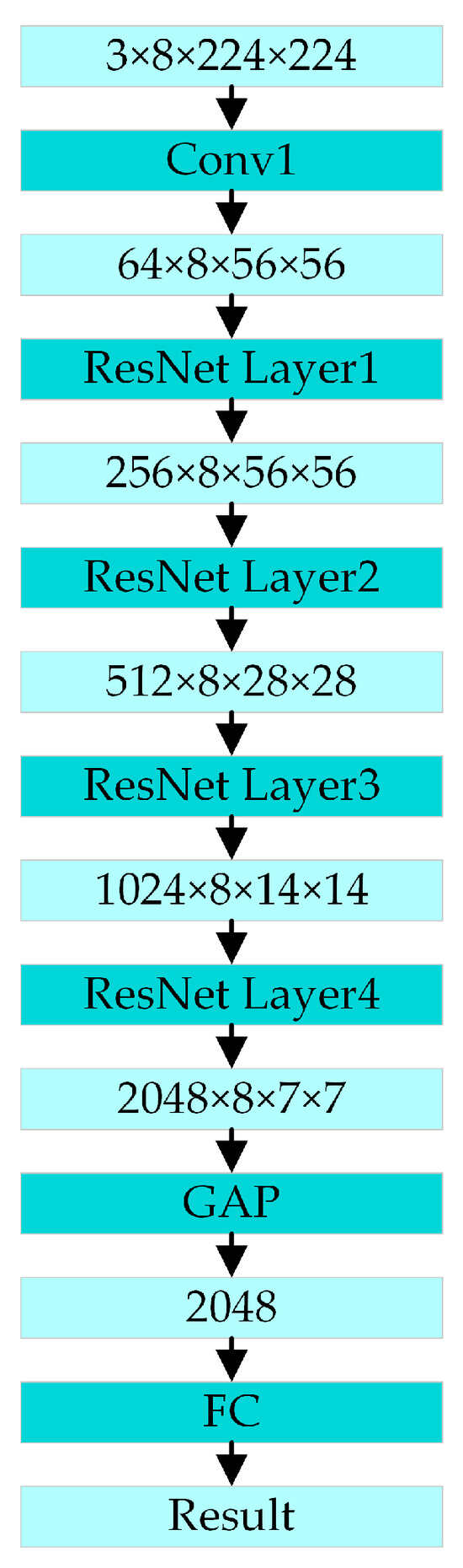 - Qian, H.; Zhou, X.; Zheng, M. Abnormal Behavior Detection and Recognition Method Based on Improved ResNet Model. Comput. Mater. Contin. 2020, 65, 2153–2167. [Google Scholar] [CrossRef]