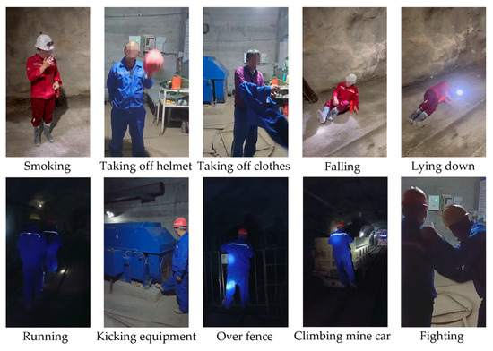 The UAUM dataset is constructed by selecting the real RGB videos from which the industrial surveillance cameras in situ are recorded at different locations in a specific underground mine. The dataset includes ten types of UAUM (as shown in Table 1). The dataset has 600 video clips in total, and each UAUM has 60 video clips. All the video clips last approximately 8 s and are recorded at a uniform frame rate of 30 fps. A total of 75% of the video clips are used as the training set, while the rest of 25% are used as the test set. Part of the image samples from the UAUM dataset are shown in Figure 11; due to privacy concerns, parts of the images have been pixelated.