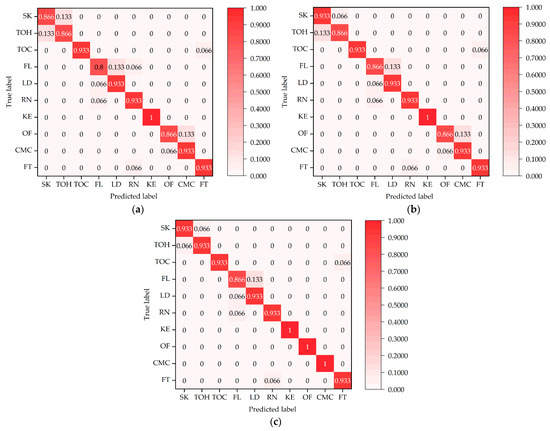 Normalized confusion matrices of the recognition models: (a) normalized confusion matrix of PoseC3D; (b) normalized confusion matrix of CBAM-PoseC3D; (c) normalized confusion matrix of CBAM-MFFAR.