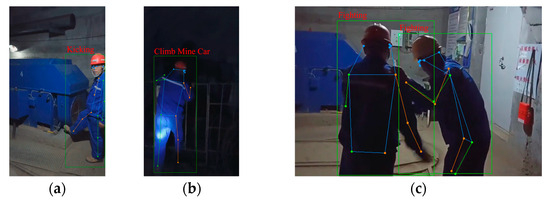 Using reliable technology to strengthen the recognition and control of MUB can effectively reduce the occurrence of accidents in underground mines and ensure the safe production of mining enterprises. With the rapid development of modern industry, many computer technologies, such as big data [3], cloud computing [4], the Internet of things [5], artificial intelligence [6], etc., are applied in the production and supervision of mines [7]. The emergence of computer vision technology provides a new tool for identifying the unsafe behavior of humans and preventing man-made accidents. Many research achievements on human action recognition have been carried out based on this technology [8,9], and many algorithms for human action recognition have been developed and applied to recognize MUB in underground mining. For example, Qian et al. [10] utilized an improved residual network model to detect abnormal human action. Guan et al. [11] proposed a method for recognizing unsafe actions, combining a 3D convolutional neural network and a long short-term memory network, demonstrating strong performance on specific abnormal action datasets. Chen et al. [12] integrated an adaptive self-attention mechanism and weighted feature pyramid network into a YOLO network to recognize unsafe actions such as smoking in industrial settings. Yang et al. [13] introduced the spatial–temporal relation transformer method for identifying unsafe actions on construction sites. Li et al. [14] applied an improved Faster R-CNN-LSTM network to identify unsafe actions, particularly excelling in distinguishing fuzzy actions well. Based on computer vision technology, Wen et al. [15] presented a recognition method by utilizing a residual network and transfer learning to recognize MUBs. Shi et al. [16] proposed a MUB recognition algorithm based on an improved Alphapose-STGCN, achieving the recognition accuracy of 82.3% on the coal mine underground action dataset. Wang et al. [17] applied an optimized YOLOv8 to identify non-standard miner’s actions while balancing computational complexity with recognition accuracy. Wang et al. [18] constructed a coal miner’s action-recognition model that combined spatiotemporal dual-branch structure with transposed attention representation mechanism, achieving an accuracy of 92.37% on their self-built miner action dataset.