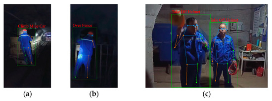 Partial recognition results by using the CBAM-MFFAR model to recognize the UAUMs are shown in Figure 16. It can be seen that the “over fence” and the “climbing mine car” actions, which involve similar climbing motions and are misidentified by the CBAM-PoseC3D model, are accurately recognized. In multi-person identification scenarios, the action of multiple people taking off their safety helmets can also be accurately identified.