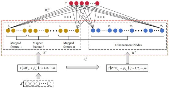 where and represent randomly generated weights and biases, respectively. is the feature-mapping function. After obtaining all the feature nodes, the enhancement nodes () for the jth group can be calculated using Equation (2).