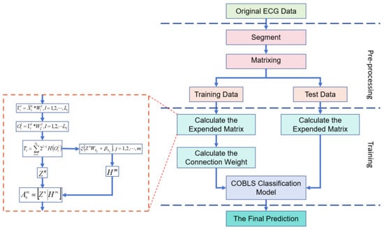All the experiments were conducted on a workstation equipped with a core (E5-2630V4), CPUs (2.20 GHz × 20), RAM (32.0 GB), and an Nvidia GeForce GTX 1080Ti graphics processor, using the Matlab software platform. Figure 3 illustrates the overall experimental process, which begins by segmenting the ECG signals without denoising. Subsequently, the partitioned data are separated into training and test sets, in which the training set is employed to train the COBLS algorithm, while the test set is used to evaluate the COBLS’s performance.