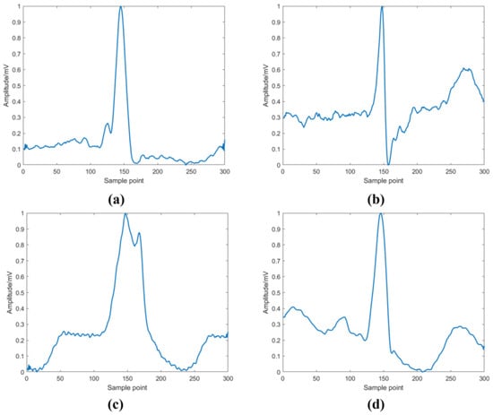 Schematic illustrations of four types of heartbeats: (a) N-type heartbeats, (b) S-type heartbeats, (c) V-type heartbeats, and (d) F-type heartbeats.