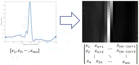 We used a scheme to convert segmented heartbeat signals into a matrix, which enables the two convolutional layers in the model to more fully mine the features of heartbeat signals, effectively improving the feature-mining efficiency of the model. Specifically, the one-dimensional (1D) beat is segmented and arranged into a 2D ECG matrix (pseudo image) with a certain number of rows and columns. The specific processing process is shown in Figure 6 and is based on the transformation equation of the waveform and grayscale image. The one-dimensional data are rearranged into a two-dimensional matrix by the reshape function to increase its sensory field during convolution so that the network can extract more adequate features. In Figure 6, the heartbeat can be viewed as an vector with 300 sample points reshaped into an matrix. In Figure 6, represents the ith sampling point of the heartbeat.