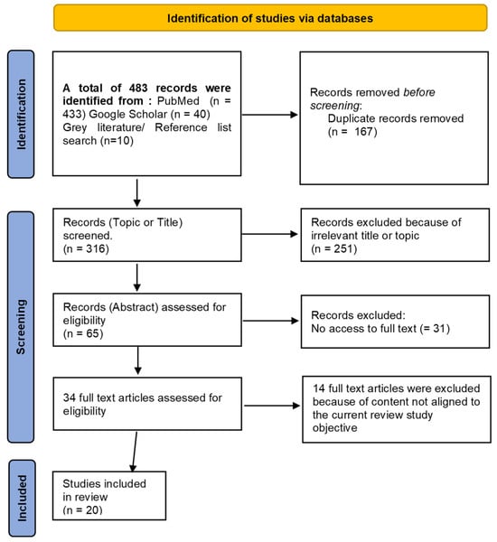 We conducted a systematic literature search across various electronic databases (PubMed, Google Scholar) and grey literature sources (organizational websites such as US EPA, WHO, European Commission, IAEA). Furthermore, we scrutinized the reference lists of relevant articles. Our search strategy employed a combination of keywords and MeSH terms to capture all pertinent studies: indoor radon AND (short-term measurement OR long-term measurement Indoor radon AND (United States OR Europe OR US OR EU). We included studies written in English regardless of publication date. Following the PRISMA framework, we identified relevant studies through a multi-stage screening process. The initial search in PubMed and Google Scholar yielded 473 articles (433 + 40). After adding 10 records from agency websites and reference lists, a total of 483 articles were screened. Ultimately, 20 studies met the inclusion criteria and were selected for this critical review. A comprehensive search strategy, following the PRISMA framework, is outlined in Figure 1 below.