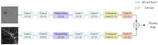 The methods of multi-source data fusion are diverse and plentiful. Instead of using the traditional method of directly concatenating the deformation map and topographic data into dual-channel data, we first employed two independent single-channel feature extraction modules to separately extract texture features from landslide samples and topographic features from topographic data. Then, we fused the feature maps of the two modules at a higher level through feature map concatenation (Formula (1)). This feature extraction and fusion network is a pseudo-Siamese network without shared weights, which has shown good performance in detecting landslides by fusing optical images and DEM data [33]. As shown in Figure 2, the network comprises two identical convolutional neural networks (CNNs) that can be used for feature extraction. The purpose of using this network is to enhance the model’s ability to detect landslides. The CNN is designed to be lightweight and can serve as a common feature extractor, while also being well-integrated with other networks. In this network, we employed batch normalization (BN) and Rectified Linear Unit (ReLU) activation, which stabilize the network gradient propagation and accelerate the training speed. We used feature map concatenation for feature fusion, and the formula is as follows: