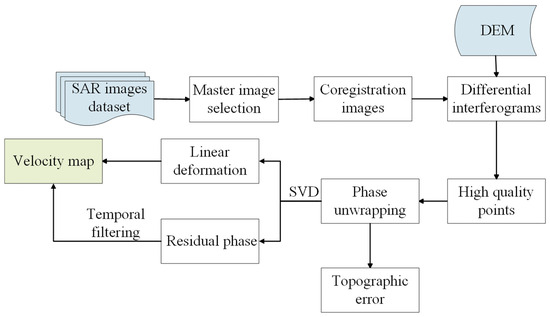 The deformation rate and topographic error of each pixel in each time period can be calculated by Formula (11). The initial deformation time series can be obtained by the integration of time differences and deformation rates. The Least Squares (LS) method was used to estimate the linear deformation rate of each pixel. The residual phase can be obtained by subtracting the linear deformation and topographic error from the initial deformation time series. The nonlinear deformation can be extracted from the residual phase by spatial and temporal filtering. The final deformation time series was derived by combining the nonlinear deformation with the linear deformation. Finally, the average deformation rate of each pixel can be calculated by the LS method.
