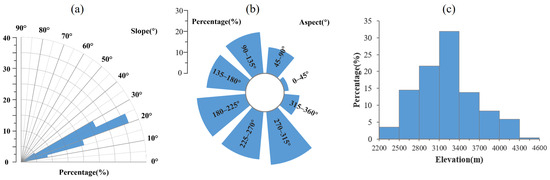 Statistical percentage of landslides by (a) slope gradient, (b) slope aspect, (c) elevation.