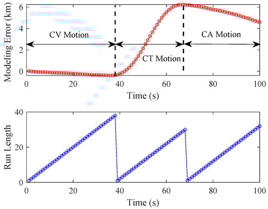 In modern target tracking, non-cooperative targets are capable of making very sharp and evasive maneuvers to avoid tracking and locking on. Assume that a hostile aircraft initially travels at a constant velocity (CV) of 200 m/s for 33 s, then enters a constant turn (CT) of 10 deg/s for 33 s, and the target accelerates in a straight line at 3 . As shown in the upper figure in Figure 1, when using the nominal CV model to represent the target motion, the magnitudes of modeling errors in the x-axis resulting from target maneuvers vary over time and change significantly when the model is switched. As shown in the lower figure in Figure 1, the change points can divide the target flight into several non-overlapping motion segments, known as the run length, which refers to the length of flight time since the last change point [], and the model parameters during each run-length segment are assumed to be constant or slow-varying. The objective of this paper is to perform adaptive state estimation by continuously adjusting the process noise level.