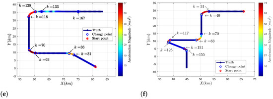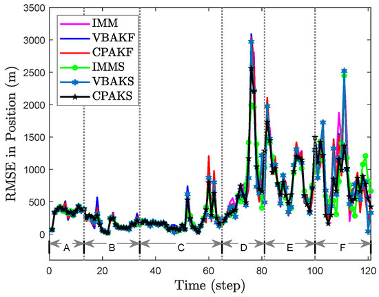 The parameter settings for all methods in the real-world scenario are similar to those in the simulated scenario. The results are depicted in Figure 5. The ARMSE and average time cost for all methods are summarized in Table 5. The results show that the performance differences of all algorithms in segments A, B, C, and D are not significant. However, the RMSE peak values of CPAKF in segments E and F and CPAKS in segments D, E, and F are significantly smaller than those of the other algorithms, which indicates their better performance in the final ARMSE results. The set of detected change points for CPAKF is (second), and for CPAKS it is (second). For , the score metric of both CPAKF and CPAKS is 0.5.