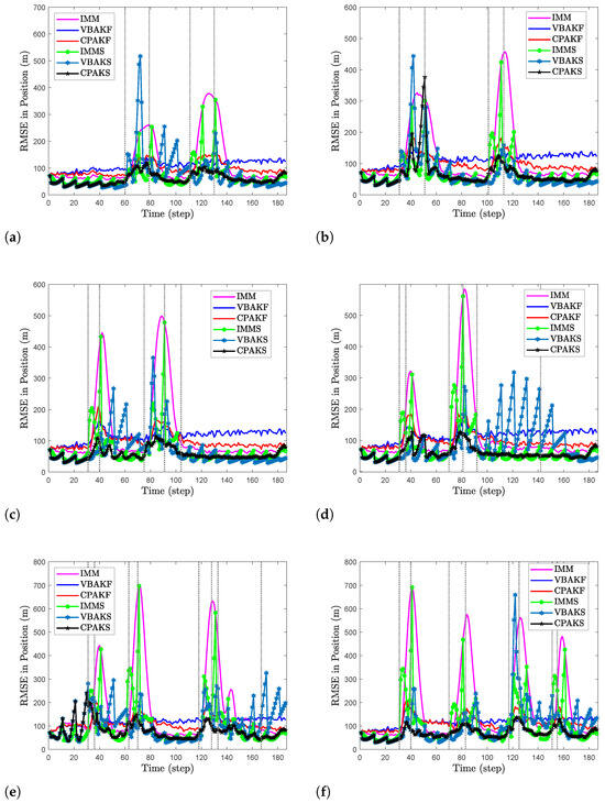 The simulation results are shown in Figure 3. The gray dotted line indicates the moment when the target maneuvers. Among the three filtering algorithms, i.e., IMM, VBAKF, and CPAKF, the estimation accuracy of IMM in the non-maneuvering segment across all scenarios shows a significant advantage because IMM employs multiple models, allowing for better estimation through model probability weighting. Second is the CPAKF algorithm proposed by us. Its RMSE is significantly lower compared to VBAKF. This is mainly because CPAKF uses a run-length probability weighting method to obtain the maximum entropy distribution of the state estimation, which is better than the single-mode estimation used in VBAKF. In the maneuvering segments, the estimation performance of IMM is not satisfactory, especially after a change point occurs, which leads to a significant increase in its RMSE. In comparison, the other two adaptive filtering algorithms are more robust since adaptive filtering can adjust process noise adaptively in response to target maneuvers, while the IMM relies on the completeness of its model set. When unknown maneuver patterns appear in target motion, performance degradation caused by model mismatch is likely to occur. Compared with VBAKF, CPAKF has better estimation performance in maneuver segments because it can adjust the noise parameter when a change point is detected. The performance of the three smoothing algorithms, i.e., IMMS, VBAKS, and CPAKS, is superior to the three filtering algorithms. This is because the smoothing algorithms can utilize more measurement information. Nevertheless, their performance deteriorates after a change point occurs. Specifically, CPAKS exhibits better estimation accuracy. This is because CPAKS can divide smoothing intervals through maneuver detection, effectively avoiding the impact on smoothing estimation caused by the state in the interval containing different motion modes of the target. In addition, when a change point is detected, both CPAKF and CPAKS speed up the convergence of parameter estimation by taking decisive action, such as identifying and initializing parameters to avoid falling into the local optimal solution.