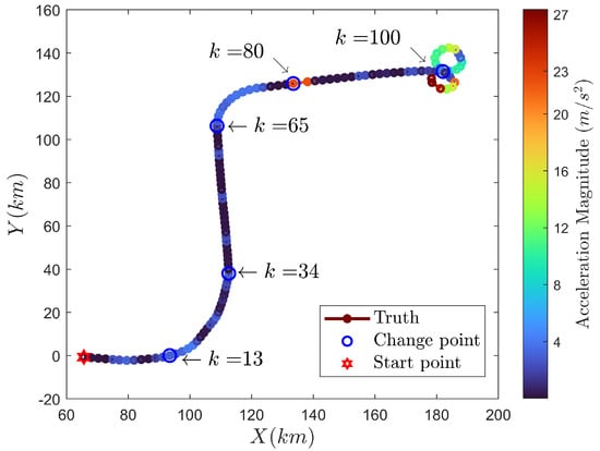 For each scenario, 100 Monte Carlo runs were carried out on a Legion Y9000P computer equipped with a CPU operating at 2.20 GHz. To evaluate the tracking performance of all the above methods, the Root Mean Square Error (RMSE) and Average Root Mean Square Error (ARMSE) were utilized. Additionally, to describe the abilities of CPAKF and CPAKS in change-point detection, the modified score metric proposed in [] was used to evaluate detection accuracy. In the practical time series, the places where change points occur are influenced by some stochastic factors (e.g., process noise and measurement noise). Based on the definition of , change-point detection is viewed as a classification problem of change points and invariant points. It can be defined as
