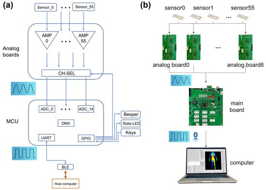 The framework is established by configuring timers (generate specific baud rate) and registers related to the ADC and UART. The ADC and UART are hindered by waiting for register access when the data are transmitted by the UART and ADC, respectively. Hence, to improve the efficiency of the movement of data, two buffer arrays are established to hold the data temporarily and global interrupts are turned on. Consequently, the DMA (direct memory access) is configured for the ADC to automatically move the sensor data from the ADC registers to Buffer Array 1, which enables the CPU to deal with other tasks. Once the data transfer is completed, the contents of Buffer Array 1 are copied to Buffer Array 2, and DMA starts the next data acquisition cycle immediately. Meanwhile, the DMA of UART is configured to transfer the data from Buffer Array 2 to the UART interface, freeing the CPU also.