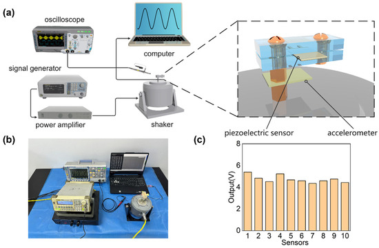The measuring of the sensors’ consistency. (a) Schematic diagram. (b) Real object. (c) The sensor output under an acceleration amplitude of 7 g.