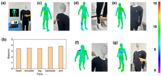 The result of the positioning precision. (a) Testing process. (b) The location bias. (c) Backside. (d) Leg. (e) Limb. (f) Shoulder. (g) Heart.