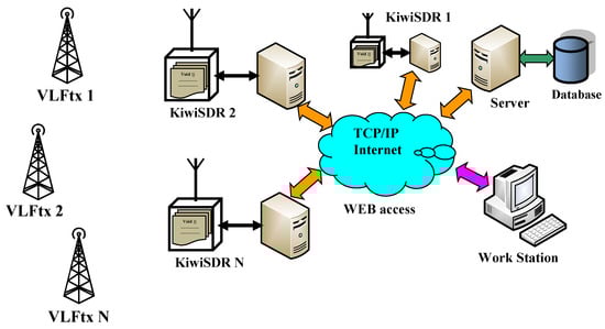This system relies on the influence of solar activity on the propagation of very-low-frequency (VLF) transmitter signals. By analyzing these signals, which are received by various spatially distributed and Internet-connected software-defined SDR receivers, the level of solar activity can be assessed. The system structure and operational concept are shown in Figure 2. At the core of the system is a KiWiSDR software-defined radio equipped with a web-based API (application programming interface) and interface, serving as the primary node.