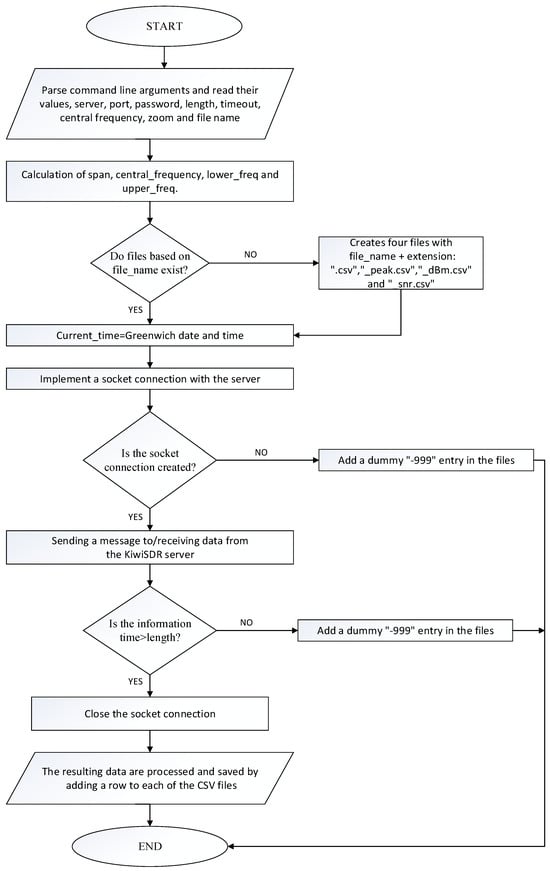 The algorithm used to connect to the KiWiSDR server and to process and record the received information.