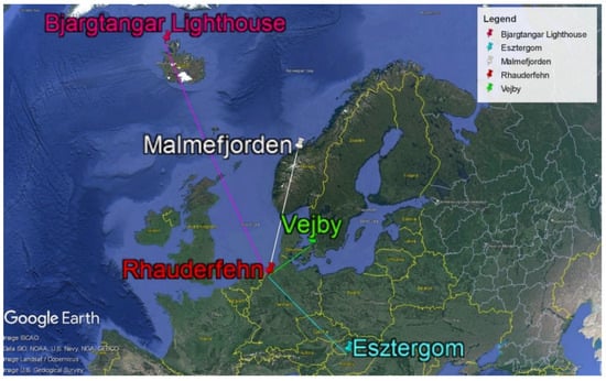 - Vejby, Denmark, http://oz1bfm.proxy.kiwisdr.com:8073 (accessed on 5 July 2024), at a distance of 444 km from the transmitter, SDR, etc.