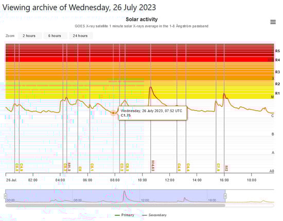 Solar flares can significantly affect the received signal power and the signal-to-noise ratio (SNR) of propagating VLF radio signals through ionosphere reflection. In the summer of 2023 (starting from 27 June 2023), this experimental SDR monitoring system was tested using different KiWiSDRs at launch. The results of the conducted system performance tests are presented below, using samples from the period 25 July 2023–9 August 2023. The resultant data are compared with solar activity data published on the online platform SpaceWeatherLive (https://www.spaceweatherlive.com/) (accessed on 5 July 2024).