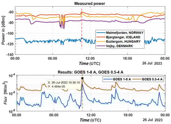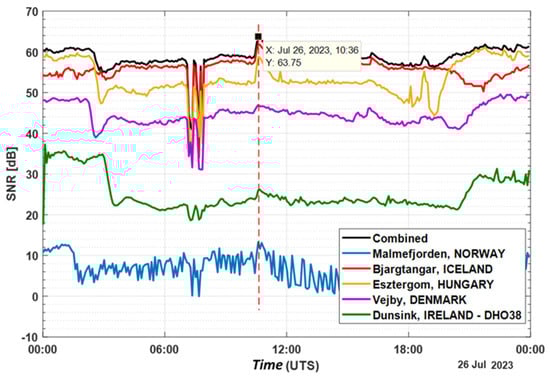 Based on the data presented in Figure 8 and Figure 9, it is evident that the system successfully documented fluctuations in the received signal power following the solar flare on 26 July 2023. Combining the measured power (signal-to-noise ratio) from multiple stations through summation improves the system’s noise immunity. Additionally, the stations in Iceland and Denmark reported an increase in the received signal level at 16:01, corresponding to a class M solar flare, while the Dunsing station reported no change in received power.
