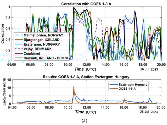 The data from the figures and table show a high correlation value at the time of the solar flare. The correlation value is higher when the signal-to-noise ratio of the measured signal is high. The Norway station’s data show a typical correlation value below 90%. Combining the signal-to-noise ratio by summation also shows an improvement in the result, with a correlation above 98%.