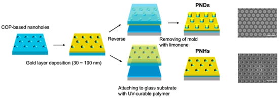 Nanoimprinting techniques can be used to solve this problem. Using the nanoimprint technique, a uniformly arrayed plasmonic nanostructure surface can be cost-effectively fabricated with only one original mold [16,17,18,19,20]. Several recent studies demonstrated that nanoimprinted plasmonic substrates work as SERS platforms [21,22]. In this study, complementary nanoimprinted arrayed plasmonic surfaces composed of nanodisks under or on nanoholes were developed for the rapid and accurate identification of methylated DNA with the adenomatous polyposis coli (APC) gene sequence, which is generally related to the regulation of important events in cell growth and cancer cells [23]. The former are called plasmonic nanoholes (PNHs), and the latter are called plasmonic nanodisks (PNDs). First, the PNHs and PNDs were fabricated and characterized, followed by optical characterization. To apply the PNHs and PNDs to SERS with 785 nm laser excitation, the plasmonic resonance wavelengths of the PNHs and PNDs were adjusted to 785 nm by tuning the thickness of the gold layer. After the characterization and optimization of the PNHs and PNDs, the SERS properties were evaluated using 4-mercapto benzoic acids (4-MBA). Finally, the capability of methylated DNA identification was investigated using the resonant wavelength-optimized PNHs and PNDs.
