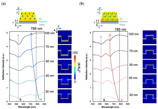 The optical characterization of PNHs and PNDs. The reflection spectrum of PNHs (a) and PNDs (b) with gold layer thicknesses ranging from 30 nm to 100 nm. The arrows indicate plasmonic modes i (blue for PNHs and red for PNDs) and ii (grey). The dashed line indicates the wavelength of 785 nm. The x-z cross-sectional enhanced electric field distributions expressed by |E/E0|2 at 785 nm are represented for each thickness of the gold layer.