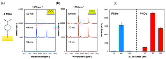 The comparison of the enhanced Raman intensity of 4−MBA by PNHs and PNDs with varied gold layer thickness. (a,b) The Raman spectrum with PNHs (10, 40, 100 nm) (a) and PNDs (10, 30, 100 nm) (b). The dashed line indicates 1080 cm−1, which is attributed to C−S (aromatic). (c) The comparison of Raman intensity at 1080 cm−1 between PNHs and PNDs. The Raman spectrum averaged 20 points with N.A. 0.8 objective lens. The error bars indicate standard deviation (SD).