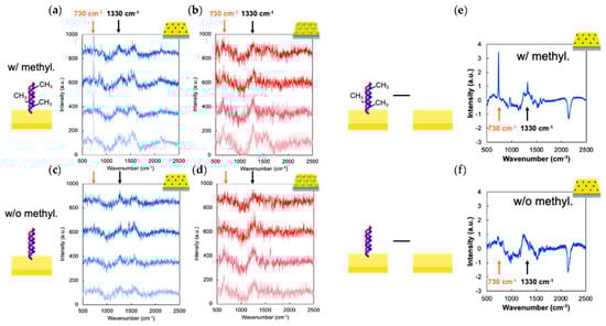 The identification of DNA methylation. (a,b) The Raman spectrum of methylated DNAs with PNHs (a) and PNDs (b) obtained from 4 separate samples. The orange and black arrows indicate 730 cm−1 and 1330 cm−1, respectively. (c,d) The Raman spectrum of unmethylated DNAs with PNHs (c) and PNDs (d). (e,f) The Raman spectrum obtained by subtracting that of bare PNHs from that of DNAs with PNHs.