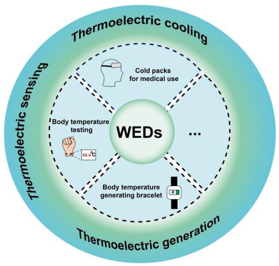 Besides being employed as sensors to monitor light, temperature, pressure, blood oxygen levels, etc., WEDs are also widely used in energy harvesting systems that convert various types of environmental energy into electricity, based on effects like photoelectric, thermoelectric, piezoelectric, hydropower, etc. Even though it is considered a green renewable energy source, hydropower engineering requires a continuous water source and materials with good hydrophilicity, like graphene, carbon nanotubes, carbon black, etc. [12,13,14,15,16]. Meanwhile, hydropower sensors have limited potential in sewage detection, seawater purification, sweat detection, etc. Photoelectric materials have been widely used in flexible imaging, bionic vision systems, human–machine interactions, etc. [17,18,19]. However, low radiation absorption, high detection limits, and low resolution are still the bottlenecks encountered in the application of photoelectric sensors in accurate detection. The strain-dependent charge output of piezoelectric materials has been typically used for the collection of energy from human movement [20,21,22] and monitoring of eye fatigue [23,24]. Although the previously mentioned methods can yield a beneficial quantity of energy, the focus on thermoelectric materials has intensified owing to their broad prospects in sensing and energy capture applications, along with their capability to transform heat directly into electrical power without the requirement for movable components or upkeep. Given that the human body persistently produces thermal energy within a spectrum of 100 to 525 W, harnessing this wasted body heat through thermoelectric gadgets could result in the generation of 1 to 5.25 W of electrical energy [25].