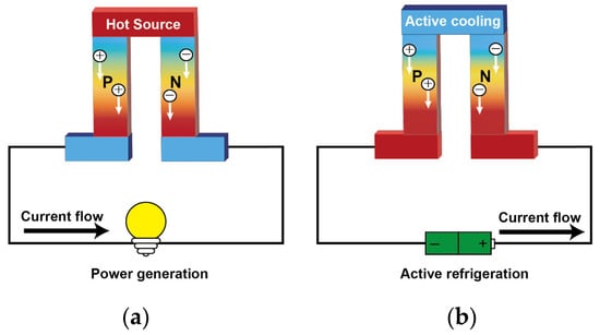 Application of Seebeck and Peltier effects: (a) schematic diagram of thermoelectric generator; (b) schematic diagram of thermoelectric cooling.
