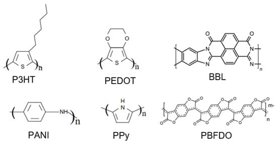 Conductive polymers are widely used as organic thermoelectric materials; these include poly(3,4-ethylenedioxythiophene) (PEDOT), polyaniline (PANI), polypyrrole (PPy), poly(3-hexylthiophene) (P3HT), and some n-type conducting polymers such as poly(benzodifurandione) (PBFDO) and poly(benzimidazobenzophenanthroline) (BBL). Some of these molecules’ structures are shown in Figure 3. In this section, we will briefly discuss the representative organic thermoelectric materials.